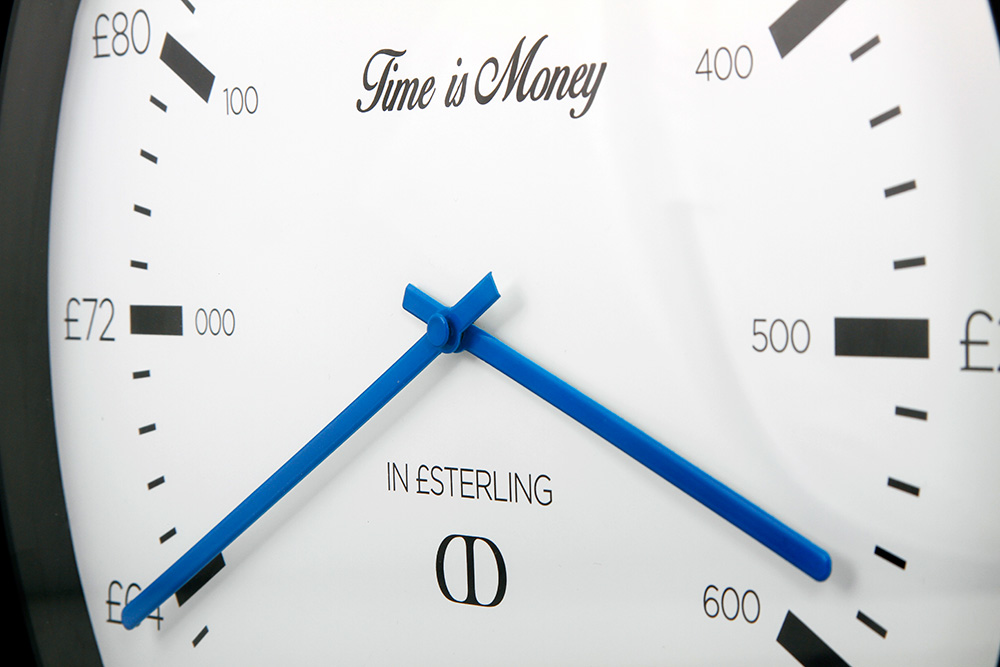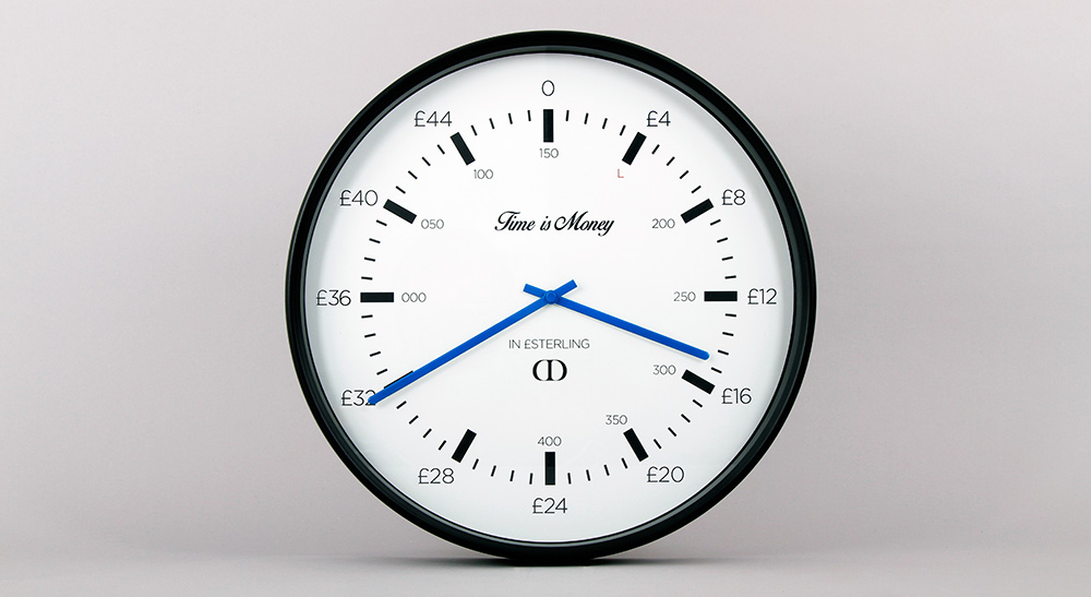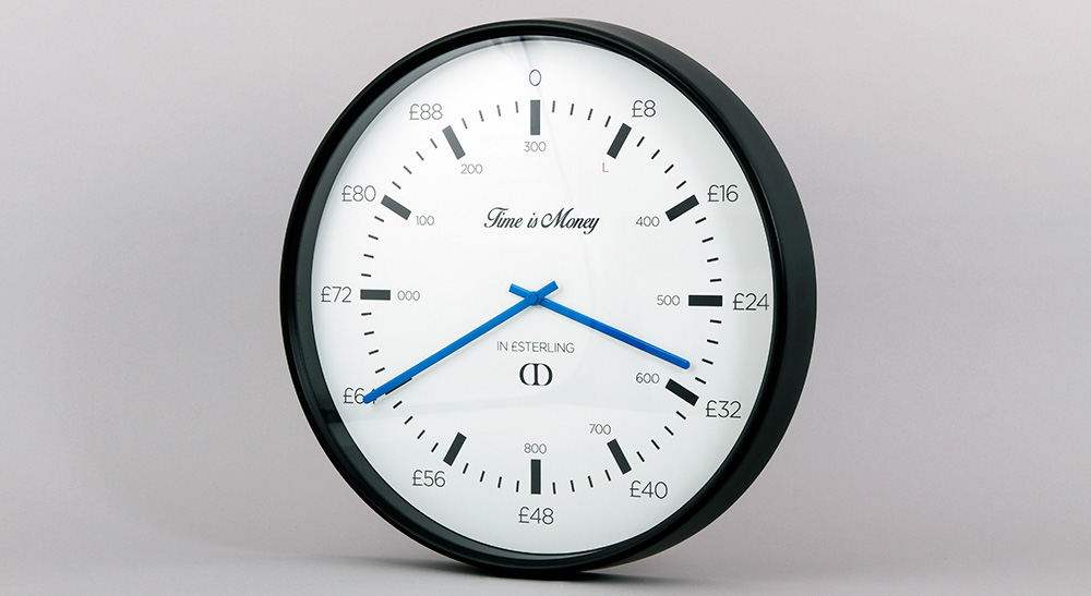'Time is Money' is a gift to project managers struggling to cope with meandering creatives. The clock provides a gentle reminder that whilst ideating and being creative are very important there is also a cost attached to the time they spend. The main set of numbers divides their hourly rate into 5 minute chunks while the inner set divides their day rate into hourly chunks and includes a lunch break.The clock can be adapted to cover different day rates and currencies.